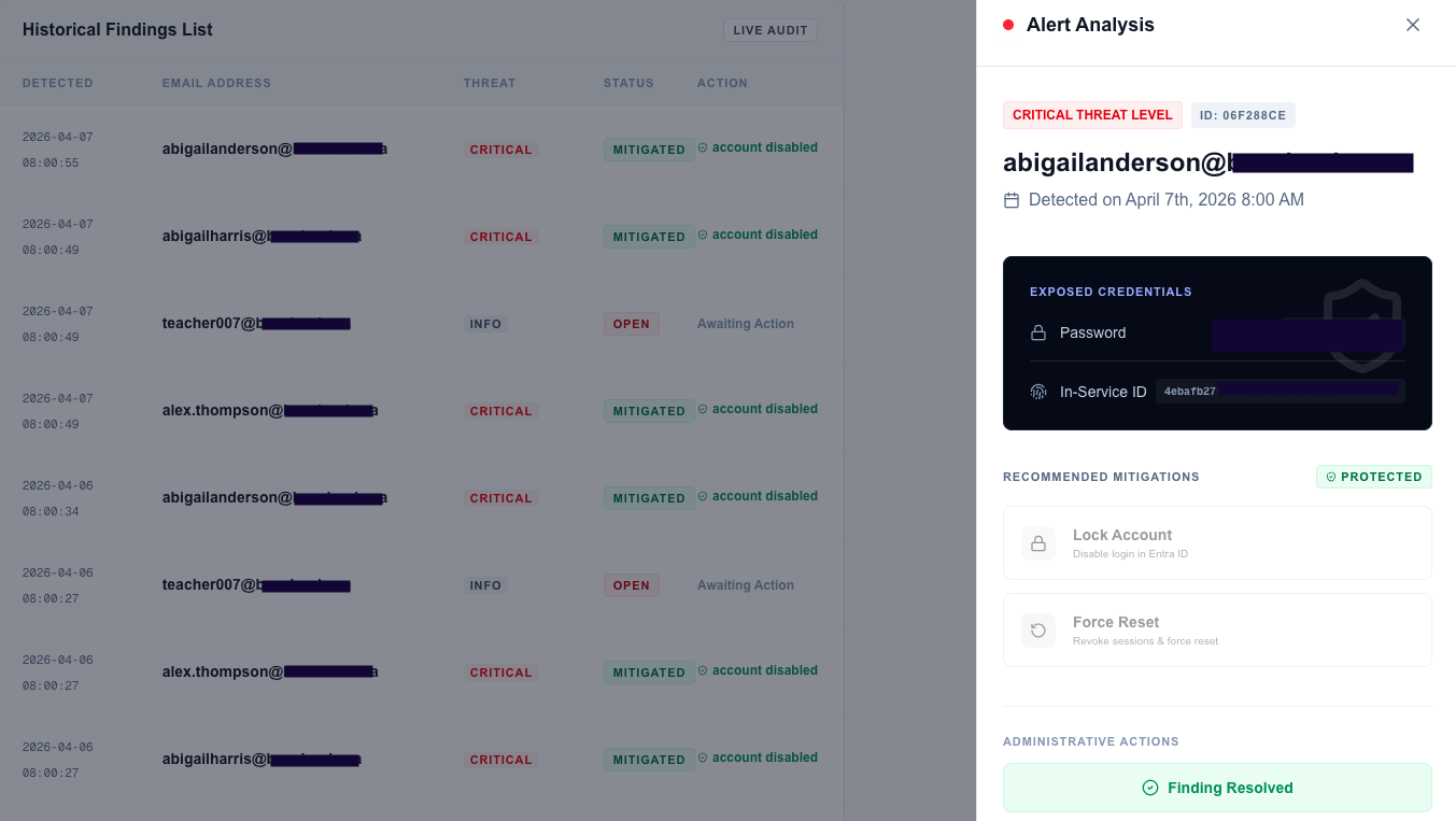 We detected risks outside an institution's line of sight where an employee that had retired over 10 years ago became subject to a phishing campaign. Their credentials were compromised, and we were able to notify the institution about the exploit, thereby preventing reputation damage that they didn't even realize was unfolding.